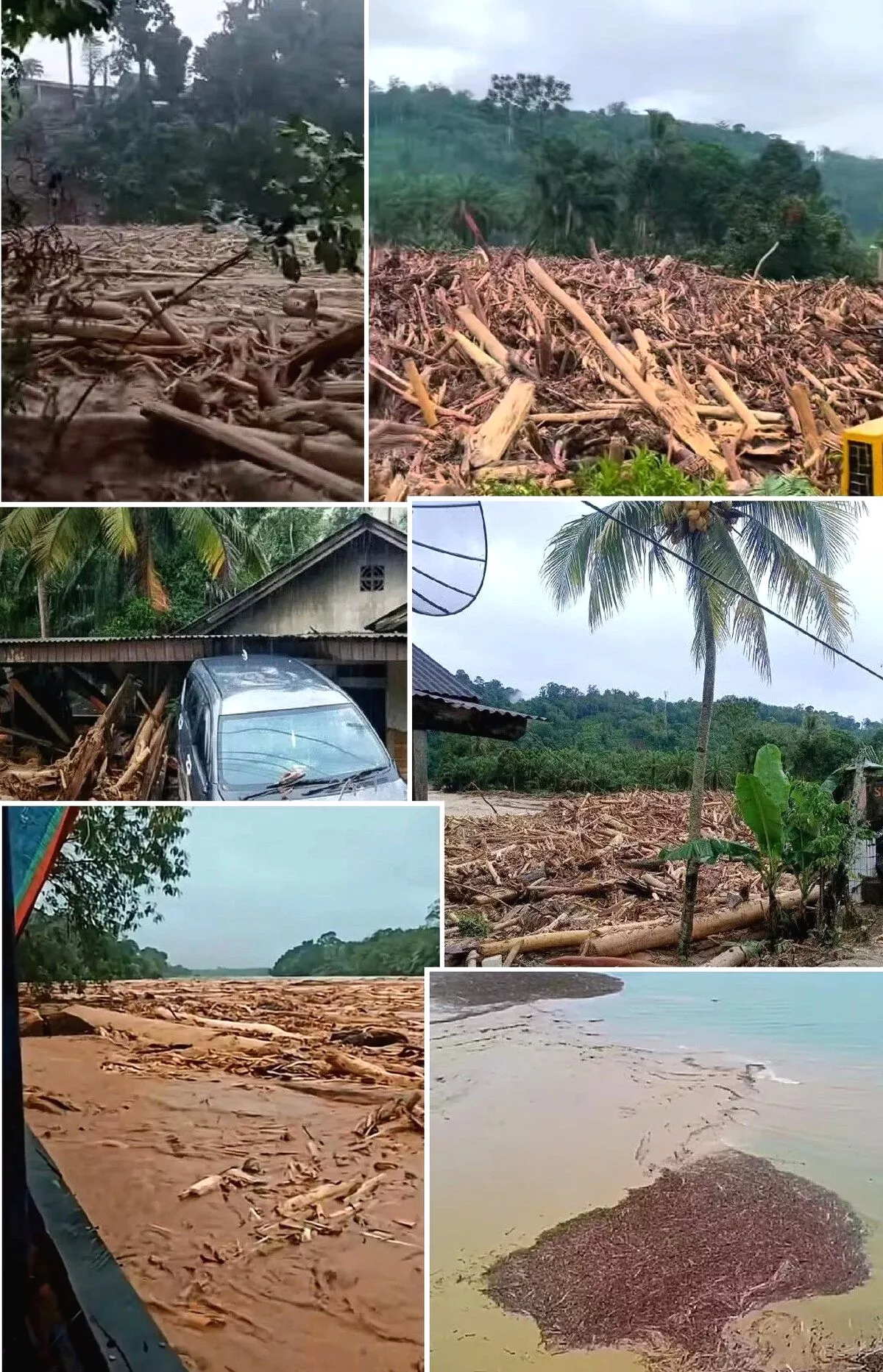 Tumpukan gelondongan tersebut mengindikasikan adanya aktivitas pembalakan atau pembersihan lahan yang memperparah daya rusak banjir.