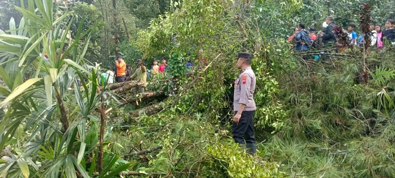 Deretan pohon pinus tumbang tak hanya menimpa rumah warga, tetapi juga sempat menutup akses jalan utama yang menghubungkan Doro dan Petungkriyono.