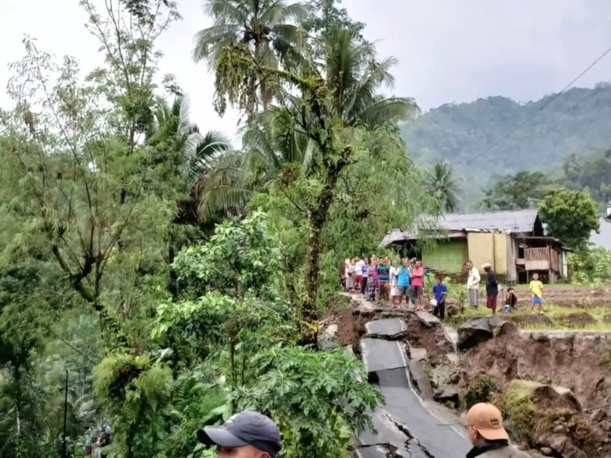 Hujan dengan intensitas tinggi dalam waktu cukup lama memicu pergeseran tanah, yang menyebabkan longsor dan amblasnya jalan kabupaten setempat.