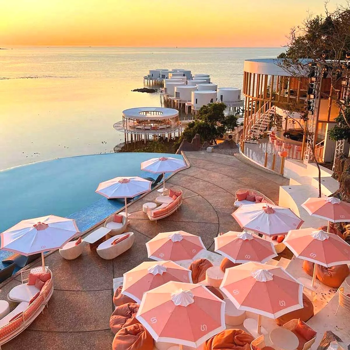 Resort yang tampil mencolok dengan warna putih dan pink itu menawarkan konsep vila mewah berbentuk tabung yang berdiri langsung di atas perairan.