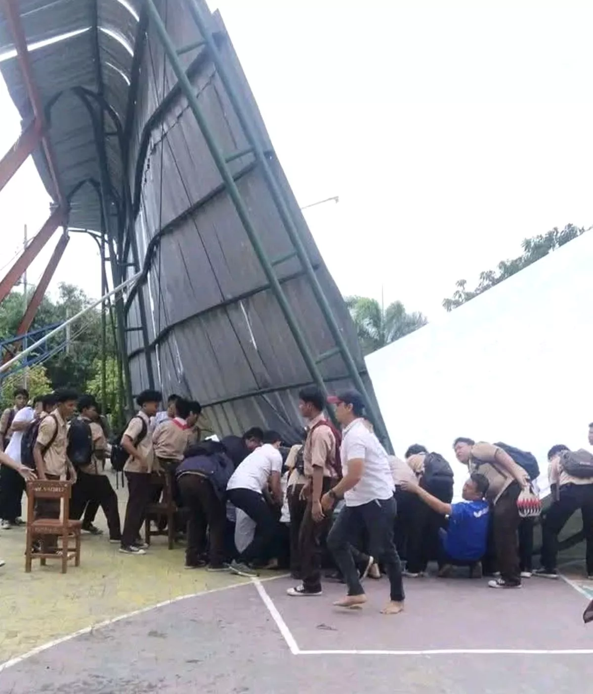 Saat kejadian, cuaca di wilayah tersebut dilaporkan tidak bersahabat, dengan hembusan angin yang cukup kuat menerpa area sekolah.