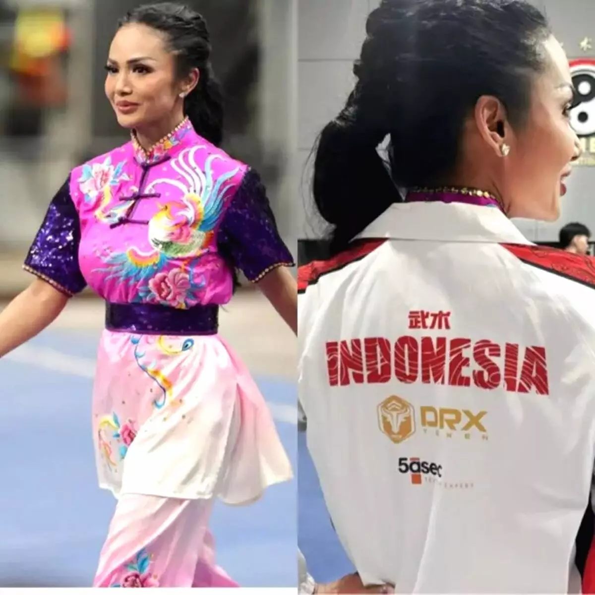 Unggahan tersebut memperlihatkan Kris Dayanti tengah melakukan simulasi gerakan wushu dengan kostum bernuansa ungu muda dan merah muda.