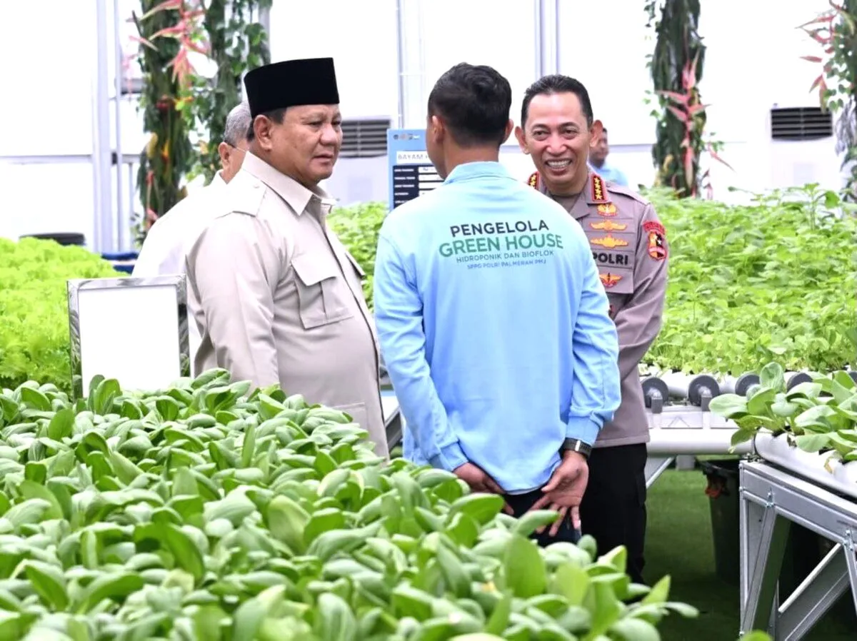 Sebelum peresmian, Presiden Prabowo meninjau area pameran SPPG Polri dan melihat langsung green house yang menjadi bagian dari rantai pasok bahan baku SPPG Polri.