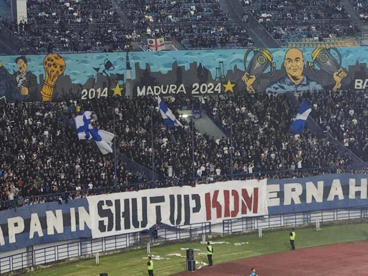 Tidak seperti kebanyakan atribut suporter yang biasanya berisi dukungan atau pesan penyemangat bagi tim, spanduk ini justru memuat tulisan bernada tajam.