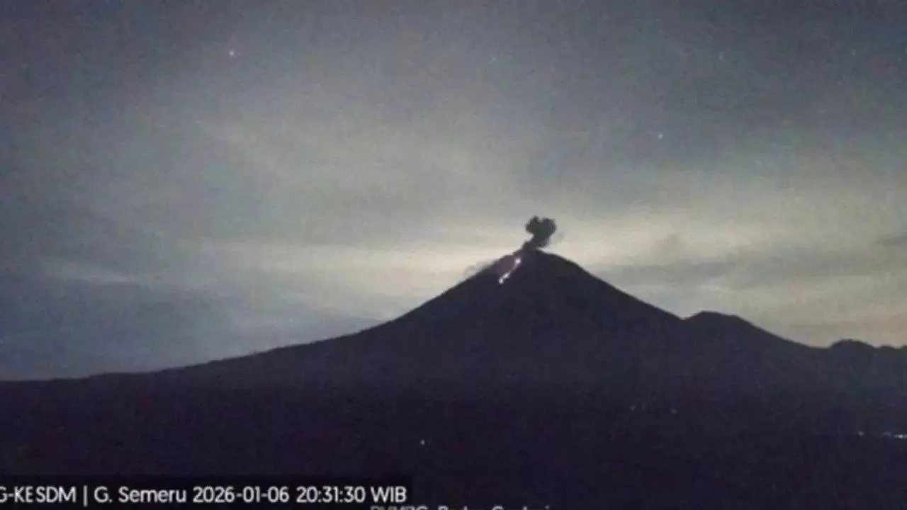 INBERITA.COM, Gunung Semeru di Lumajang Jawa Timur kembali menunjukkan aktivitas vulkanik yang signifikan pada malam hari, Selasa (6/1/2026).