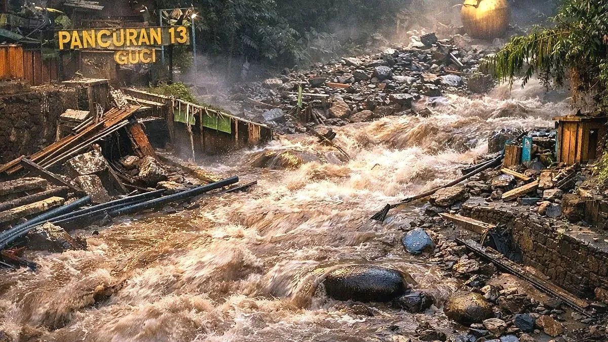 Banjir bandang yang datang secara tiba-tiba itu membawa material lumpur, pasir, hingga batu-batuan berukuran besar. Arus deras menghantam kawasan Pancuran 13, salah satu titik paling ikonik di Guci.